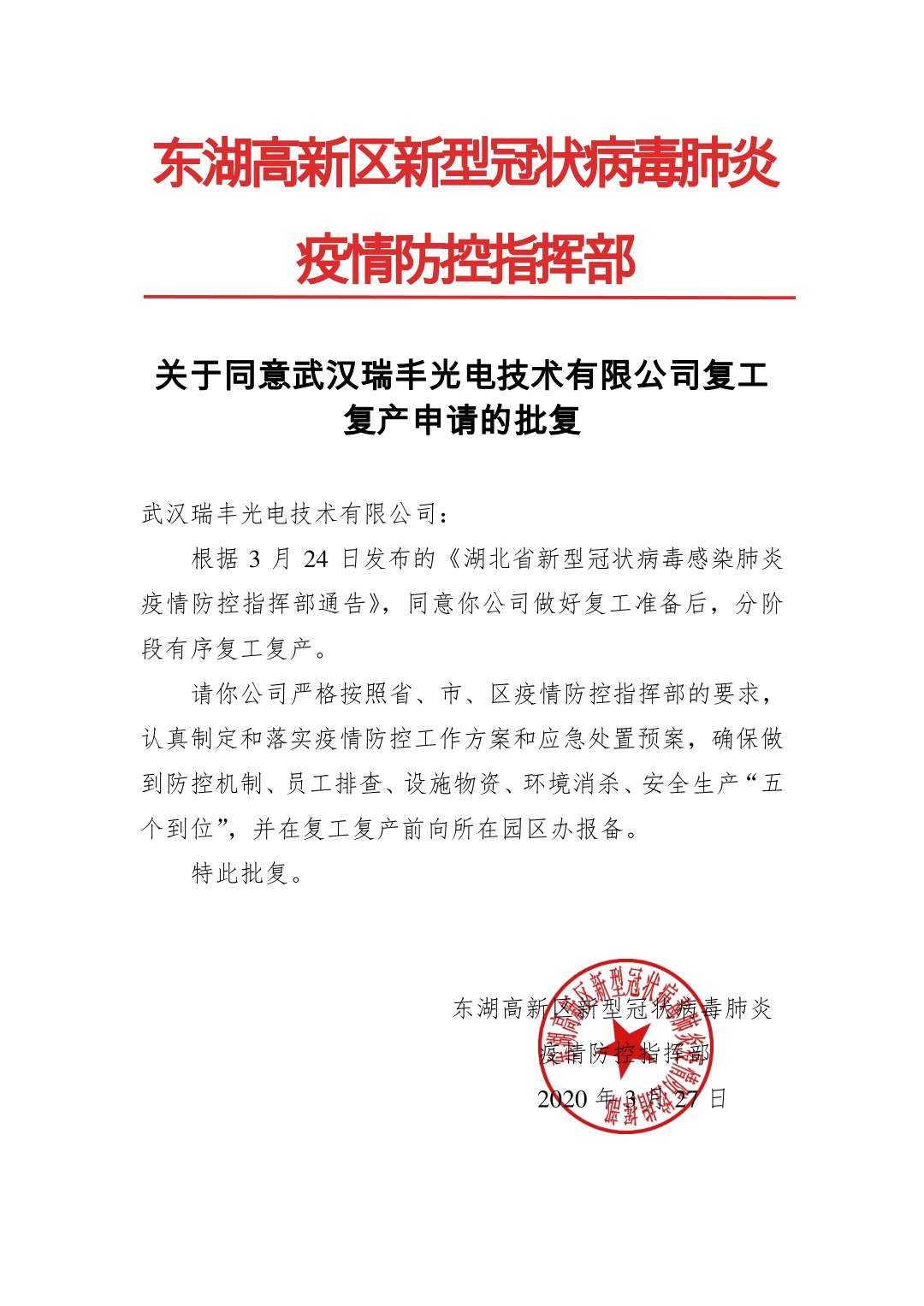 在萬眾一心抗擊疫情的非常時(shí)期,堅(jiān)決貫徹黨中央重要決策部署,認(rèn)真落實(shí)省、市會(huì)議精神及上級工作要求,隨著新型冠狀病毒肺炎疫情防控工作的進(jìn)展,疫情的控制也逐漸走向明朗的方向, 武漢瑞豐光電技術(shù)有限公司也快速響應(yīng)防疫管控號召,在通過審批后,于2020年3月30日起正式復(fù)工。